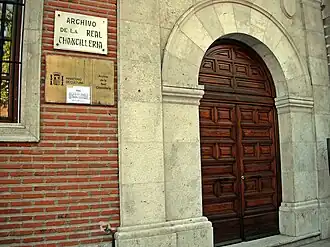 - Archivo: Dentro del propio tribunal de la Chancillería, existió desde los primeros momento una unidad de archivo, responsable de la custodia y gestión de los documentos producidos por las diversas salas de justicia a través de las escribanías de cámara correspondientes. Esta unidad actuó como archivo de oficina para las demás unidades del tribunal y fue la responsable de gestionar las transferencias de pleitos desde las escribanías hasta el archivo. Además, desde 1682 contó con un edificio propio de depósito, conocido cono el "Archivo Viejo" y situado al lado del edificio del tribunal (actualmente, es el Palacio de Congresos Conde Ansurez Archivado el 20 de abril de 2020 en Wayback Machine., perteneciente a la Universidad de Valladolid).