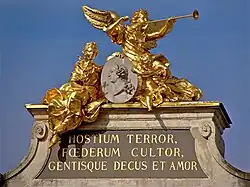 Coronando el arco encima de la acrotera, se disponen las estatuas doradas de Minerva, Pax (la diosa romana que personifica la paz) y Feme (la diosa romana que personifica la gloria), sosteniendo un medallón con el perfil de Luis XV.[9] La figura de Feme sostiene una trompeta en su mano izquierda y una corona de laurel en su mano derecha. Todas estas estatuas son obra de Barthélemy Guibal.