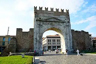 - ↑ a b c d e «Arco d’Augusto, storia di uno dei simboli di Rimini». RiminiToday (en italiano). Consultado el 27 de octubre de 2023.
