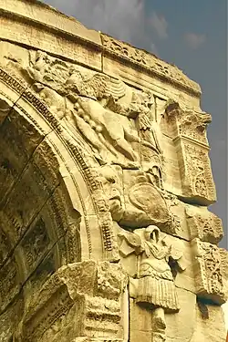 Las deidades patronas de la ciudad, Apolo y Minerva, aparecen en los dos frontones delanteros, en bigas tiradas por grifos y esfinges. Otras interpretaciones toman las figuras de las bigas como representantes de Lucio Vero y la diosa Roma, respectivamente.