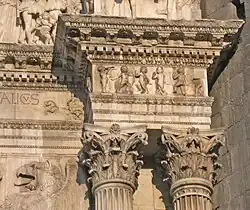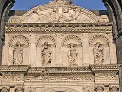 El arco superior fue coronado con una serie de hornacinas con estatuas cubiertas por un tímpano con forma de arco, que retoma el estilo de Donatello.[1]
