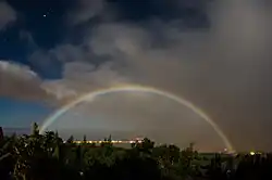 Un arcoíris lunar (también conocido como arcoíris blanco o sencillamente arco lunar)[1] es un arcoíris que ocurre por la refracción de la luz solar, en este caso lunar, sobre una lluvia o neblina nocturna. Los arcoíris lunares son relativamente tenues, debido a la escasa cantidad de luz que llega desde la Luna. Como los arcoíris, los arcos lunares se encuentran siempre en el lado opuesto del cielo desde el que llega la luz de la luna.