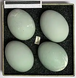 La hembra suele realizar una puesta de tres a cinco huevos,[14] aunque a veces puede poner solo dos o llegar a los siete huevos. Los huevos son de color azul verdoso claro con la superficie mate. Miden una media de 60x43 mm. Suele poner los huevos con intervalos de dos días entre cada uno y el siguiente, y la incubación empieza con la puesta del primer o segundo huevo. Ambos miembros de la pareja toman parte de la incubación, que dura unos veinticinco días. Ambos progenitores llevan comida a los polluelos. Al principio los polluelos toman el alimento regurgitado del pico de los adultos. Más tarde los adultos regurgitan la comida en el nido y los polluelos se la disputan. Los polluelos tardan siete u ocho semanas en dejar el nido. Generalmente hay una sola nidada por temporada, aunque algunas veces se registran dos.[15]