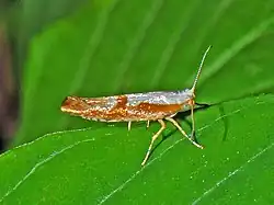 Tiene una envergadura de 10-13 mm.[1] Las alas anteriores son de color marrón rojizo con una banda dorsal blanca y una banda marrón transversal oscura en el medio. Las antenas son blancas con bandas marrones. A lo largo del borde inferior de las alas anteriores se encuentran una serie de manchas blancas. Las alas posteriores son amarronadas y muy estrechas, con largos flecos.