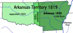 En 1800 Francia recuperó Luisiana para venderla tres años más tarde a los Estados Unidos. En 1806, se creó el Distrito de Arkansas como parte del Territorio de Luisiana. El Congreso de los Estados Unidos, que ejercía la potestad de gobierno sobre los territorios dependientes, decidió más tarde reorganizar la administración de estos territorios, tras lo cual Arkansas pasó a formar parte del Territorio de Misuri. En 1819, Arkansas por fin adquirió estatus de Territorio, el primer paso para iniciar la negociación para su admisión como estado soberano en la Unión. El proceso de adquisición del estatus de estado de Arkansas dependió, sin embargo, de la admisión de otro estado ya que el Compromiso de Misuri estableció que solo se añadirían nuevas estrellas a la bandera si se evitaba que se rompiera el equilibrio entre estados esclavistas y estados libres. Tras las admisiones de Maine (libre) en 1820 y Misuri (esclavista) en 1821, no se admitieron nuevos estados en la Unión hasta el 15 de junio de 1836, cuando Arkansas fue admitido como estado esclavista, seguido de Míchigan en 1837 como estado libre.