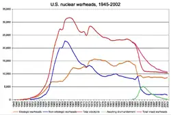 - Para 2007, el Boletín de Científicos Atómicos lista a Estados Unidos con alrededor de 5400 cabezas nucleares en total: alrededor de 3575 ojivas estratégicas y 500 no estratégicas, y sobre 1260 ojivas adicionales contenidas en el arsenal inactivo. Otras cabezas están en algún paso del proceso de desmantelar.[8]