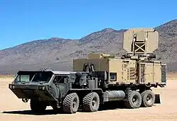 - El Active Denial System es una fuente de ondas milimétricas que calienta el agua en la piel de un objetivo humano, causando un dolor incapacitante. Fue desarrollado por el Laboratorio de Investigación de la Fuerza Aérea de EE. UU. y Raytheon Technologies para tareas de control de disturbios. Aunque está destinado a causar un dolor severo sin dejar un daño duradero, se ha expresado preocupación sobre si el sistema podría causar daños irreversibles a los ojos. Aún no se han realizado pruebas de los efectos secundarios a largo plazo de la exposición al haz de microondas. También puede destruir blindajes electromagnéticos.[34] El dispositivo puede tener varios tamaños, e incluso conectarse a un Humvee.