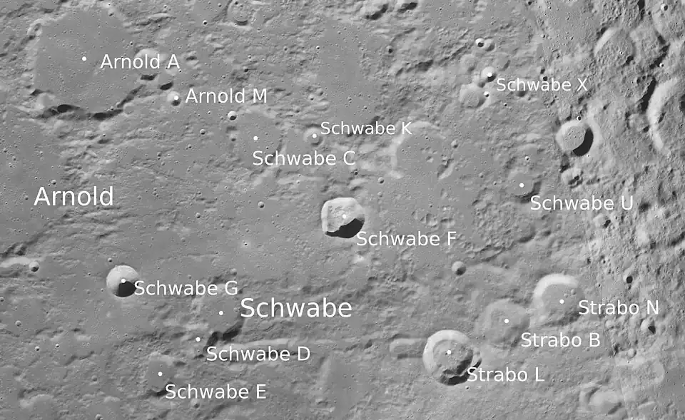 Por convención estos elementos son identificados en los mapas lunares poniendo la letra en el lado del punto medio del cráter que está más cerca de Arnold.