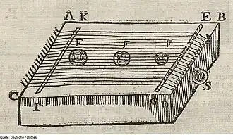 - Kircher, Athanasius: Neue Hall- vnd Thon-Kunst, Oder Mechanische Gehaim-Verbindungen der Kunst und Natur, durch Stimme und Hall-Wissenschafft gestifftet, Worinn ingemein der Stimm, Thons, Hall- und Schalles Natur, Eigenschafft, Krafft und Wunder-Würckung... in gleichen wie die Sprach- und Gehör-Instrumenta, Machinen und Kunst-Wercke... verfertiget werden. Übers. von Agatho Carione (d. i. Tobias Nisslen), Schultes, Nördlingen 1684, S. 104 ff.
