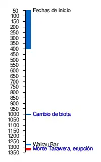 Mientras que la mayoría de los investigadores ahora usan esta fecha de finales del siglo XIII,[18] otros lo están revisando al alza todavía más, alrededor del año 1320 o más tarde, basándose en nuevas evidencias de las cáscaras de los huevos y de la erupción de Kaharoa del Monte Tarawera. (1314±6 d. C.), cuya tefra forma una capa geológica debajo de todos los sitios humanos y de ratas bien datados.[19][20] Algunos investigadores concluyen ahora que el peso de toda la evidencia de radiocarbono y ADN apunta a que Nueva Zelanda se estableció rápidamente en una migración masiva en algún momento después del año 1300,[21] lo que sugiere que la teoría de la «gran flota» no estaba totalmente equivocada después de todo.