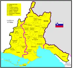 - en el ente de descentralización regional de Gorizia las comunas de: Dolegna del Collio, Cormons, Capriva del Friuli, Mossa, San Floriano del Collio, Gorizia, San Lorenzo Isontino, Moraro, Medea, Mariano del Friuli, Farra d'Isonzo, Savogna d'Isonzo, Romans d'Isonzo, Gradisca d'Isonzo, Sagrado, Villesse, Fogliano Redipuglia, Doberdò del Lago, San Pier d'Isonzo, Ronchi dei Legionari, Turriaco, Monfalcone, Staranzano, San Canzian d'Isonzo y Grado (que incluye unas 30 islas en la laguna de Grado).