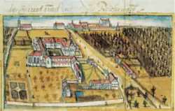 El conjunto del palacio está rodeado por murallas y más allá están instaladas las casas de los comerciantes, el mercado, los hoteles de los obispos, de los abades, de los vasallos y los grandes dignatarios. Más lejos se encuentra el parque de caza y la casa de fieras rodeada por un muro.