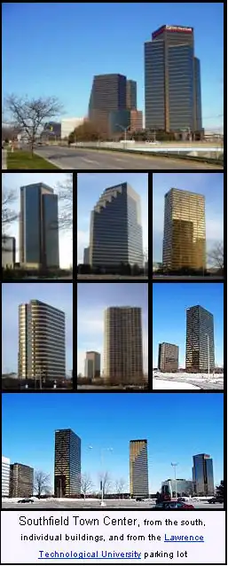 Además de los rascacielos Town Center, las torres modernas de Southfield incluyen el American Center de 26 pisos (1975) de SmithGroup y One Towne Square (1992) de Rossetti con 21 pisos. Otros centros de comercio notables en el área son Dearborn, Troy y Auburn Hills. Dearborn contiene la sede mundial de la Ford Motor Company. El Adoba Hotel de lujo de 14 pisos de Dearborn (1976) con su diseño arqueado contemporáneo de Charles Luckman se encuentra entre los centros de conferencias de la región, con 772 habitaciones. Rossetti diseñó el moderno Ritz-Carlton Hotel de Dearborn (1988) junto con el complementario Fairlane Plaza North and South (1990), así como las Parklane Towers (1973). Troy tiene una gran cantidad de edificios de oficinas, muchos de los cuales están situados a lo largo del corredor de Big Beaver Road. El más alto de estos es el edificio Top of Troy (1975), una torre triangular de 27 pisos. Troy también contiene lo que generalmente se considera el centro comercial más exclusivo de la región, la Somerset Collection.