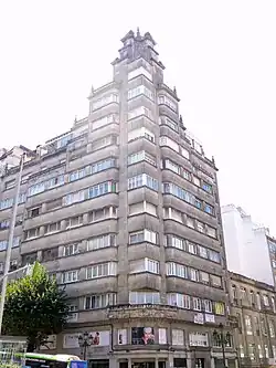- Salgueiro García Barbón. Data del año 1934, se encuentra situado en la Puerta del Sol y es obra de Romualdo de Madariaga. El edificio de estilo racionalista consta de cinco plantas, su estructura interior es de hormigón, mientras que sus muros exteriores son de granito. En sus fachadas destacan elementos propios del art decó ocasionalmente adornados con piezas de cerámica, como en sus pilastras, o en las formas redondeadas de estilo expresionista de su chaflán.[65]