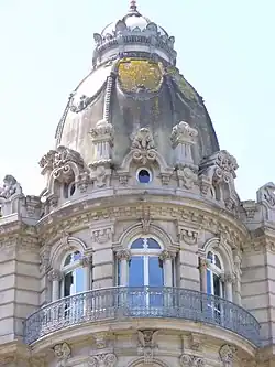 - Sede social del Real Club Celta de Vigo. Hasta el año 2015 fue sede del Círculo Cultural Mercantil e Industrial de Vigo, en la actualidad es la sede institucional del Real Club Celta de Vigo.[64] Los orígenes del edificio datan del año 1921, año en el que comenzaron las obras de rehabilitación de un antiguo inmueble a cargo del arquitecto Manuel Gómez Román para adaptarlo a las necesidades del Círculo Mercantil, posteriormente fue ampliado a cargo del propio Gómez Román en 1925. De estilo ecléctico con componentes clasicistas, en el que también destaca una galería que cubre el tramo central de la fachada,[67] sus elementos decorativos más destacados se encuentran en los capiteles de las pilastras y en las ménsulas que sustentan la galería. Posteriormente, tras la adquisición del edificio por parte del Real Club Celta, se realiza una reforma al inmueble conforme al proyecto del arquitecto Alfonso Penela, entre los cambios acometidos destaca el añadido de una gran cúpula acristalada en su parte superior.[68]