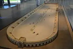 El espacio de actuación del circo romano era normalmente, a pesar de su nombre, un rectángulo oblongo de dos secciones lineales de pista de carrera, separadas por una franja mediana que recorría aproximadamente dos tercios de la pista, unidas en un extremo con una sección semicircular y en el otro extremo con una sección de vía indivisa cerrada (en la mayoría de los casos) por una puerta de salida distintiva conocida como el carceres, creando así un circuito para las carreras.