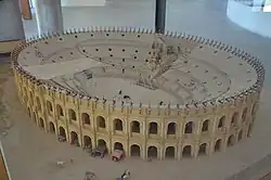 El anfiteatro era, con el arco triunfal y la basílica, el único nuevo tipo importante de edificio desarrollado por los romanos. Algunos de los edificios seculares más impresionantes son los anfiteatros; se conocen más de 200 y muchos de ellos están bien conservados, como el de Arlés, así como el Coliseo de Roma. Fueron utilizados para la lucha de gladiadores, exhibiciones, reuniones públicas y corridas de toros, cuya tradición aún sobrevive en España y en gran parte de Hispanoamérica. Su forma y funciones los distinguen de los teatros romanos, que tienen una forma más o menos semicircular; de los circos (similares a los hipódromos) cuyos circuitos mucho más largos fueron diseñados principalmente para carreras de caballos o carros; y desde los estadios más pequeños, que fueron diseñados principalmente para carreras de atletismo. Cuando los anfiteatros eran inundados con el fin de representar batallas navales, eran llamados naumaquias, aunque en ocasiones las naumaquias fueron construidas como edificaciones independientes.