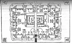 Durante la dinastía Song, la ciudad de Bianjing estaba rodeada por tres recintos, la muralla exterior de la ciudad, la muralla del centro urbano y el palacio en el centro. El centro urbano es rectangular, con tres puertas en cada lado.[7] El complejo del palacio también es rectangular con cuatro torres de vigilancia en cada esquina. Hay cuatro puertas principales: la Puerta de Xihua al oeste, la Puerta de Donghua al este, la Puerta de Gongchen al norte y la Puerta de Xuande, también conocida como la Puerta de Duan o Xuandelou, al sur. La puerta de Xuande consiste en cinco paneles pintados de rojo y decorados con clavos de oro. Las majestuosas paredes del palacio están adornadas con dragones, fenghuangs y nubes flotantes que combinan con las vigas talladas, el ático está pintado y el techo está hecho de azulejos. Dos cabezas de dragones brillantes (llamadas chi wei) están ubicadas en cada extremo agudo del borde superior del techo, con la cola de los dragones dirigida hacia el cielo. La función simbólica de chi wei se explica en el Yingzao Fashi: «Hay un dragón en el mar del Este, con la cola (wei) similar al halcón (chi), que alimenta las olas y es la causa de las lluvias, por lo tanto, las personas ponen su representación en los techos para evitar el fuego, pero erróneamente lo llamaron la cola del halcón (wei-chi)».[8]