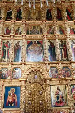 El iconostasio, también llamado el τεμπλον/templon, se trata de una pantalla o pared entre la nave y el santuario, que está cubierta con iconos. Normalmente tiene tres puertas, una en el centro y una a cada lado: la central —tradicionalmente llamada «Puerta Hermosa»—, solo es utilizada por el clero y hay momentos en que se cierra durante el servicio y se dibuja una cortina; las laterales —llamadas «Puertas de los Diáconos» o «Puertas de los Ángeles», ya que a menudo se representaron en ellas a los arcángeles Miguel y Gabriel— son utilizadas por diáconos y servidores para entrar en el santuario. Por lo general, a la derecha de la Puerta Hermosa (mirando desde la nave) está el icono de Cristo, luego el icono de San Juan el Bautista; el icono de la izquierda es el Theotokos, se muestra siempre celebrando a Cristo; y luego el icono del santo a quien esté dedicada la iglesia (es decir, el patrón). A menudo hay otros iconos en el iconostasio pero varían de iglesia en iglesia. La cortina es también abierta y cerrada en varios momentos del servicio.