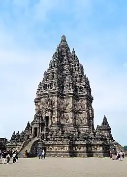 Los templos se llaman candi (tʃandi) en Indonesia, ya sean budista o hinduistas. Un candi se refiere a una estructura basada en el tipo indio de un santuario unicelular, con una torre piramidal encima y un pórtico para la entrada,[49] construido en su mayoría entre los siglos VII y XV.[49][50] En la arquitectura balinesa hindú, un santuario candi se puede encontrar dentro de un compuesto pura. El mejor ejemplo de la arquitectura del templo hinduista javanés indonesio es el templo del siglo IX Prambanan (Shivagrha), ubicado en Java Central, cerca de Yogyakarta. Este templo hindú, el más grande de Indonesia, tiene tres torres principales prasad, dedicadas a los dioses Trimurti. El templo de Shiva, el templo principal más grande, tiene una altura de 47 metros.