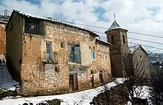 Detalle de arquitectura tradicional (vernacular) en Mas del Olmo, Ademuz (Valencia), con la parroquial al fondo.
