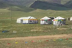 Los materiales típicamente empleados en la construcción de edificios en el Tíbet son abundantes en la zona, e incluyen la piedra, madera, cemento y tierra. Por otra parte, algunos pueblos nómadas utilizan lana de yak para cubrir sus tiendas en invierno.[2] Durante la época estival, estos pastores utilizan en su lugar tiendas de campaña más simples, hechas de lona y fáciles de transportar.[4]