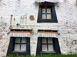 Las ventanas suelen ser pequeñas para paliar el clima soleado y de temperaturas variadas del Tíbet. El marco, llamado baka, se pinta de negro y presenta forma de trapecio; este efecto incrementa el efecto visual de las ventanas estrechas. La parte superior cuenta con un alero cubierto con telas a rayas rojas, blancas y azules.[2]