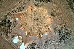 El Palacio del Partal (época nazarí), el palacio más antiguo que se conserva en la Alhambra de Granada (principios del siglo XIV)Mocárabe de la cúpula del Patio de los Leones en la Alhambra, Granada (siglo XIV). Los mocárabes permitieron el uso de patrones bidimensionales en tres dimensiones para embellecer la transición de una base cuadrada a una cúpula