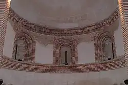 Los ábsides son poligonales, cubiertos con bóveda de cuarto de esfera precedida por un tramo recto con bóveda de cañón, soportada por varios arcos fajones de ladrillo. Es en los ábsides donde precisamente los alarifes demostraron su maestría con el ladrillo por la gran variedad de combinaciones, pues estas estructuras decorativas que se manifiestan en el exterior además de su función estética también tienen una finalidad constructiva, la de contener y moldear el relleno de gran espesor a base de tapial y argamasa. Los huecos de las arquerías y casetones son ciegos y van rellenos de mampostería y, en algunos casos, se abren pequeños huecos, las saeteras.[19]