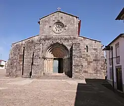 Iglesia de Santa María de Barcelos (finales del siglo XIII). Su fachada románica muestra un portal gótico y rosetón. -