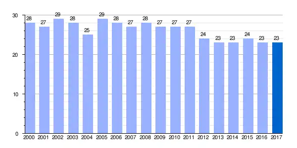 | Gráfica de evolución demográfica de Arrízala[4] entre 2000 y 2017 |