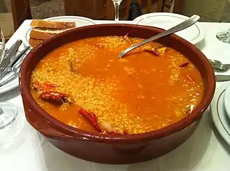 Un recipiente (sartén) de fondo amplio sobre el que se ha elaborado el arroz caldoso.Arroz caldoso de pescado y marisco.Arroz caldoso con lentejas.