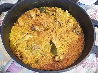 | Ingredientes | arroz · pollo · guisante · aceite · ajo · cebolla · ají · pimienta blanca · hoja de laurel · comino · bijol · pasta de tomate · cerveza · Jerez · caldo de pollo[1] | |