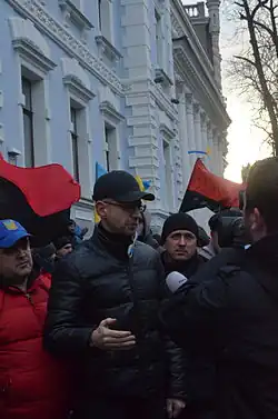 Arseni Petróvich Yatseniuk (en ucraniano: Арсеній Петрович Яценюк, Arseniy Petrovych Yatseniuk; nacido el 22 de mayo de 1974) es un abogado, político y economista ucraniano. Fue primer ministro de Ucrania,[1] tras la revolución del Euromaidán, en la que Yatseniuk fue un importante líder, que destituyó a Víktor Yanukóvich el 22 de febrero de 2014.[2][3] Yatseniuk sirvió en el gobierno de Ucrania como Ministro de Economía entre 2005 y 2006, posteriormente ministro de Asuntos Exteriores en 2007 y presidente de la Rada Suprema (parlamento) entre 2007 y 2008. Yatseniuk es uno de los líderes del segundo partido más grande de Ucrania, Unión de Todos los Ucranianos «Patria»,[4] y antiguo líder de su facción parlamentaria.[5][6][7] Arseni Yatseniuk anunció su dimisión como primer ministro de Ucrania el 24 de julio de 2014, aunque fue rechazada por una gran mayoría de los parlamentarios de la Rada Suprema el 31 de julio. En 2022, propuesto como nuevo director del Servicio de Seguridad de Ucrania.