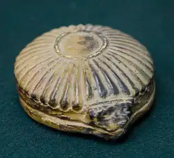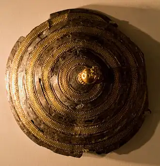 | Ornamento femenino de plata (pectoral) con una representación del dios Haldi (en el trono) y su esposa, la diosa urartiana Arubani. El pectoral está guardado en un museo en Berlín.. | Tapa de caldera de plata con una figura que representa una granada. Mencionado como propiedad de Argishti I, Museo de Historia Armenia. |