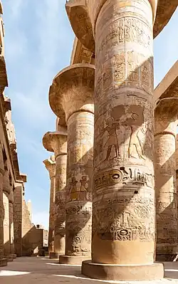 Una característica de los templos egipcios es la progresiva disminución en altura de las diferentes estancias, al tiempo que se va reduciendo la luz que penetra en ellas. De esta manera, se propiciaba un ambiente más recogido en las zonas esenciales. Los templos mejor conservados son los del Imperio Nuevo (c. 1550-1070 a. C.), especialmente los de Luxor y Karnak. Las columnas de la sala hipóstila del templo de Amón-Ra en Karnak miden 25 metros de altura.[4]