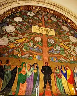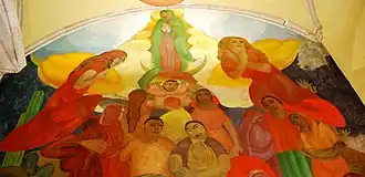 Mientras que en el siglo XIX comenzó un cambio hacia temas más indígenas y mexicanos, la Revolución mexicana de 1910 a 1920 tuvo dramáticos cambios en el arte mexicano.[50][52] El conflicto dio origen al Partido Revolucionario Nacional (renombrado después como el Partido Revolucionario Institucional), el cual entró al país con un enfoque socialista. El gobierno se convirtió en un aliado para muchos intelectuales y artistas en la Ciudad de México[33][46] y comisionó a los artistas hacer murales para los edificios públicos, para reforzar sus mensajes políticos, incluyendo mensajes que resaltaran más los temas mexicanos que los europeos. Esto no se creó para el comercio o gustos populares, sin embargo, ganaron no solo reconocimiento de México, sino también de Estados Unidos.[59] Esta producción de arte en relación con la propaganda política es conocida como la escuela modernista mexicana, o el Movimiento Muralista Mexicano, y redefinió el arte mexicano.[60] Octavio Paz dio a José Vasconcelos el crédito de ser el iniciador del movimiento muralista en México, por dar marcha a los pintores más conocidos de 1921 para decorar las paredes de los edificios públicos. Las comisiones fueron políticamente motivadas, que glorificaron a la Revolución mexicana y redefinieron al pueblo mexicano vis-á-vis su pasado indígena y español.[61] La primera de estas pinturas comisionadas estaban en el Antiguo Colegio de San Ildefonso realizado por Fernando Leal, Fermín Revueltas, David Alfaro Siqueiros y Diego Rivera. El primer fresco verdadero en este edificio fue el de Louis Henri Jean Charlot; sin embargo, los errores técnicos surgieron en la construcción de los murales; varios comenzaron a presentar ampollas y a tener que ser embarrados de cera para su conservación.[62] Roberto Montenegro pintó el Museo de la Luz, la Iglesia de San Pedro y San Pablo y el monasterio de San Pedro y San Pablo, pero el mural de la iglesia fue pintada con la técnica de pintura al temple y se comenzaron a crear escamas, en el área de los monasterios Montenegro pintó la Fiesta de la Santa Cruz, que representa a Vasconcelos como el protector del mural, este mural se modificó y quitó a Vasconcelos y lo modificó por una mujer en su lugar.[63]