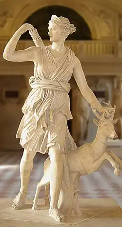 Artemisa, la diosa de los bosques y colinas, fue adorada en toda la antigua Grecia.[49] Sus lugares de culto más famosos fueron la isla de Delos (su lugar de nacimiento), Braurón (en el Ática), Muniquia (cerca de Pireo) y Esparta. A menudo se la representaba en pinturas y estatuas en un escenario forestal, llevando arco y flechas, y acompañada de un ciervo.