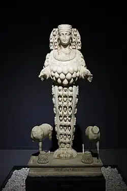 En Éfeso (Jonia, actual Turquía), su templo fue una de las siete maravillas del mundo antiguo. Fue probablemente el centro más famoso de su culto, aparte de Delos. Allí la Señora a la que los jonios asociaron con Artemisa por interpretatio graeca fue adorada principalmente como una diosa madre, semejante a la frigia Cibeles, en un antiguo santuario donde su imagen de culto representaba a la «Señora de Éfeso» adornada con múltiples protuberancias similares a pechos. Estas fueron tradicionalmente interpretadas como múltiples pechos accesorios, o (como afirmaron algunos investigadores posteriores)[64] testículos de toros sacrificados, hasta que una excavación del yacimiento del Artemision en 1987–88 identificó la multitud de perlas de ámbar con forma de lágrima que habían adornado la antigua xoana de madera. En los Hechos de los Apóstoles, cuando los herreros efesios se sintieron amenazados por las prédicas de la nueva fe que hacía Pablo, se alzaron en fervorosa defensa de la diosa, gritando: «¡Grande es Artemisa de los efesios!»[65] Solo una de las 127 columnas de Éfeso sigue en pie: el resto fueron usadas para construir iglesias, carreteras y fortalezas.