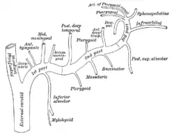 ![]() Esquema de las ramas de la arteria maxilar. La arteria esfenopalatina es visible arriba y a la derecha. | ||