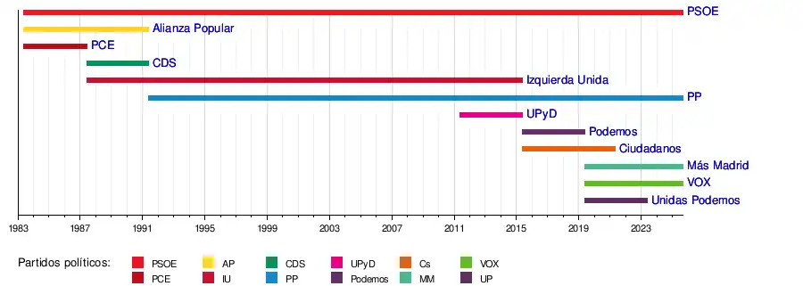 A diferencia de Cataluña, País Vasco, Galicia, Andalucía y la Comunidad Valenciana, que cuentan con un Estatuto Autonómico y una Ley Electoral propios, las elecciones a la Asamblea de Madrid "... tendrán lugar el cuarto domingo de mayo de cada cuatro años, en los términos previstos en la Ley Orgánica que regule el Régimen Electoral General", según estipula el artículo 10.7 del Estatuto de Autonomía de la Comunidad de Madrid.[11] Las elecciones, celebradas desde 1983, eligen la composición del pleno de la cámara.