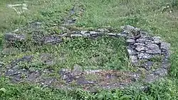 También se observa en el dibujo del Arjyz inferior colocado en la publicación de los monjes del monasterio Zelenchuksky,[3] y en el plano del área creada por V. M. Sysoev.[13] En 1979, las paredes de la estructura se abrieron en dos puntos diametralmente opuestos por V. A. Kuznetsov. Debajo de la muralla de tierra estaban los restos de un muro de piedra destruido formado por losas de arenisca que forman dos conchas (internas y externas) con un bloqueo de escombros entre ellas. Las paredes, de 2,1 metros de espesor, tienen un marcado sótano de placas gruesas que sobresalen hacia afuera hasta 10 centímetros. La medición del diámetro interno del círculo de piedra arrojó un resultado de 88,5 metros, que, según la conclusión de K. N. Afanasyev, es exactamente 300 pies romanos. Las ruinas del muro se conservan a una altura de 0.4 metros, y los expertos estiman su altura original en 4 metros —de la proporción estimada de espesor a altura, de 1 a 2—. Durante la excavación, se encontraron una gran cantidad de carbones pequeños y trozos de rejalgar o tal vez su imitación de arcilla quemada. No se encontraron restos de la capa botánica-vegetal ni fuera ni dentro del anillo.[2]