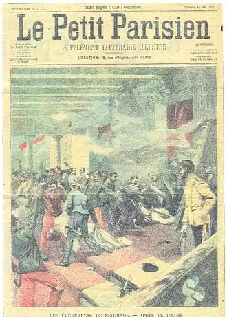 ![]() Ilustración del diario francés Le Petit Parisien sobre el asesinato de Alejandro de Serbia y su esposa. | ||