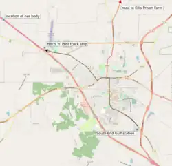 - ↑ La Prisión de Ellis Farm del Departamento de Correcciones de Texas se encuentra aproximadamente a 14 millas (23 km) de donde se descubrió el cuerpo.[7]