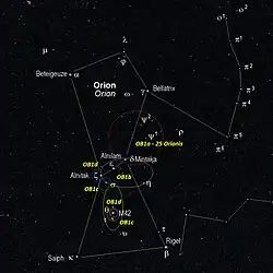 El término fue introducido por Víktor Ambartsumián en 1947[2] para diferenciarlo de otras asociaciones estelares como los cúmulos abiertos y los cúmulos globulares, ya que al contrario de éstos, apenas tienen un vínculo gravitatorio entre sus componentes. Son estrellas gigantes de secuencia y del tipo espectral O y B, principalmente, formado por varias decenas de miembros entre las que destacan las estrellas del cinturón de Orión: Alnitak, Alnilam y Mintaka, también cuenta con estrellas de menor masa e incluso protoestrellas. Es por lo que en un periodo corto de varios millones de años, las estrellas asociadas OB acaban por disgregarse por completo y se relacionan con otras estrellas de campo.[3] La asociación OB1 de Orión es la más estudiada y mejor conocida de todas, está plenamente relacionada con el complejo de nubes moleculares de Orión, donde hay formación estelar activa. Una característica de la asociación es que todas las estrellas tienen el mismo movimiento propio y ayudan a la formación automantenida de los brazos espirales de la galaxia. Las estrellas O y B son estrellas gigantes y muy calientes.