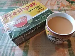 La planta del rooibos (familia de las legumbres) se cultiva solamente en la región de Cederberg incluida en la provincia Occidental del Cabo.[2][3] Incluye a una gran familia que alcanza a más de 200 variedades.[4] Las hojas del árbol se dejan oxidar al sol y se refiere popularmente a este proceso como una fermentación (no se trata técnicamente de una fermentación, se denomina así para hacer una equivalencia con la producción del té). Este proceso oxidativo es el que le proporciona a la planta el sabor y el color 'rojo' característico. Existe igualmente una producción "no fermentada" (es decir no oxidada) que se denomina rooibos verde (pretendiendo hacer una denominación similar con el té verde). Esta variedad se comercializa a un precio mayor que la variedad "fermentada" y posee un color amarillento característico; posee una gran cantidad de polifenoles antioxidantes.