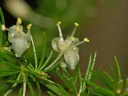 Esta esparraguera se diferencia de las otras por la gran cantidad de pequeños cladodios de color verde oscuro que cubren casi toda la planta; es frecuente que tenga el porte de una pequeña liana. Vive en lugares más frescos y sombríos, pero es muy posible que coincida con otras especies de esparragueras en los mismos lugares. Florece al final del verano.