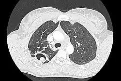 TAC en el que puede apreciarse la existencia de una caverna tuberculosa abajo izquierda, en cuyo interior se ha formado un aspergiloma masa redonda blanquecina. | ||