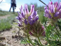 Astragalus: nombre genérico derivado del griego clásico άστράγαλος y luego del Latín astrăgălus aplicado ya en la antigüedad, entre otras cosas, a algunas plantas de la familia Fabaceae, debido a la forma cúbica de sus semillas parecidas a un hueso del pie.[4]