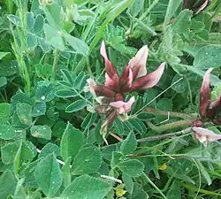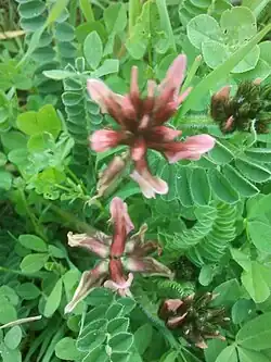 Astragalus: nombre genérico derivado del griego clásico άστράγαλος y luego del Latín astrăgălus aplicado ya en la antigüedad, entre otras cosas, a algunas plantas de la familia Fabaceae, debido a la forma cúbica de sus semillas parecidas a un hueso del pie.[3]
